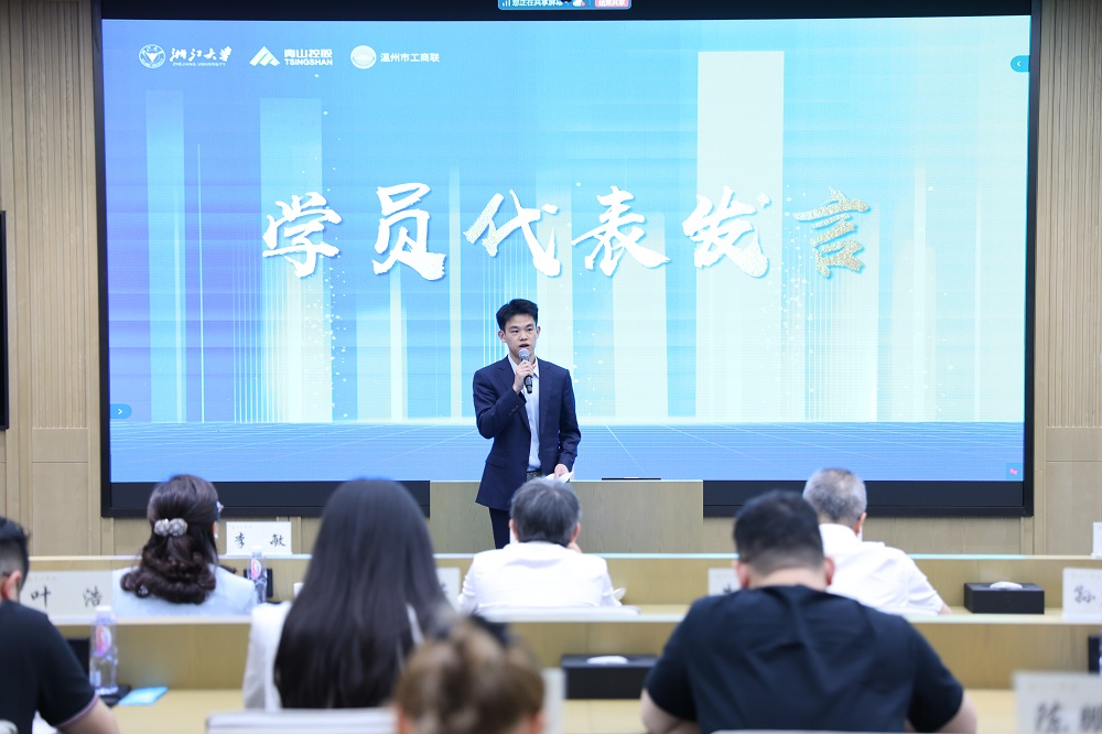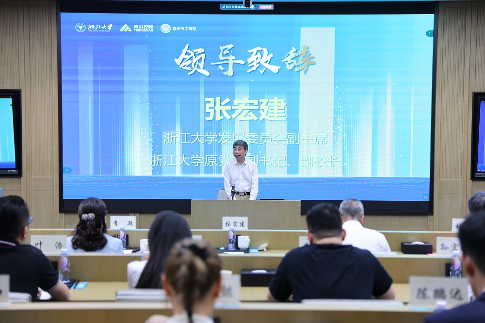 张宏建在致辞中对温州市委市政府和壹号娱乐-com实业长期以来对浙江大学的支持表示感谢,勉励在座学员以科技创新、产业创新、市场创新、金融创新的“四创精神”进一步发扬老一辈浙商的“四千精神”,开辟新领域、新赛道,塑造发展新动力、新优势,勇当发展新质生产力的先锋,为温州乃至全国的经济发展注入持久动能。