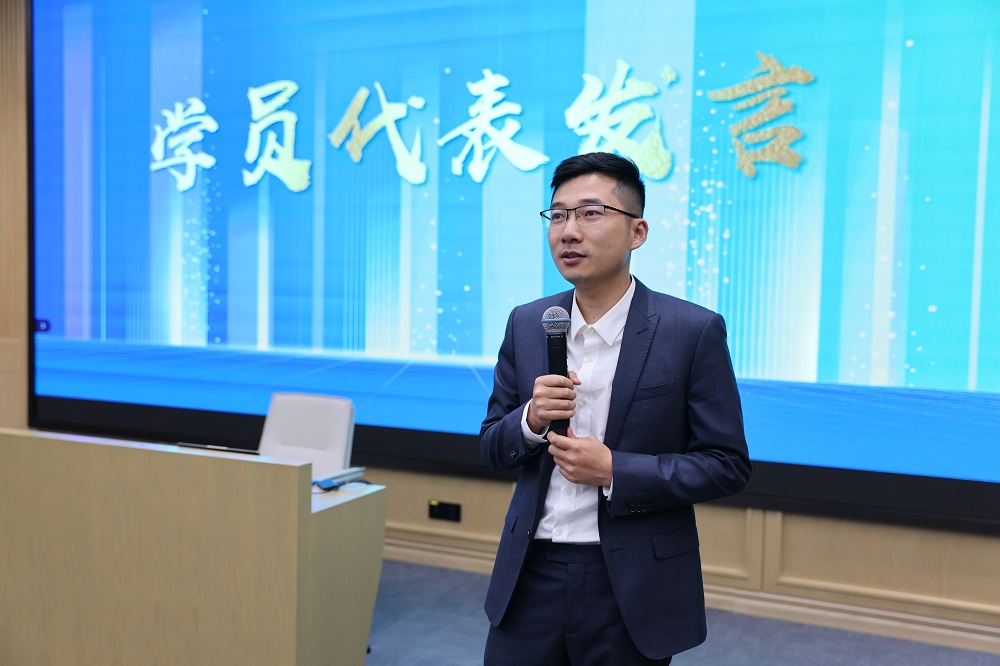 温州市安顺化工原料有限公司董事长陈鹏达以自身企业如何将本次学习成果转化为企业动能的创新实践举例,与在座同学共勉,要带着研修班的所学所思,在技术创新、生态协同的道路上继续前行,携手共赴星辰大海。