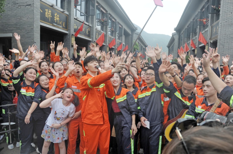 青拓物流5#、6#、7#码头在热烈气氛中盼来了主持人张蕾和嘉宾刘烨。门座式起重机拔地参天,货运轮船如海上堡垒,以白马河荡漾水波为背景,员工们身着工服簇拥着明星嘉宾,橙红鲜亮,深蓝沉稳,汇成色彩与歌声的海洋。放声高歌,振臂挥舞,以歌言梦,“奋斗才会有幸福,劳动最风流”,青拓人吹响时代号子;“富饶神州我的故乡,东西南北绚丽的舞台”,青拓人为新时代点赞!