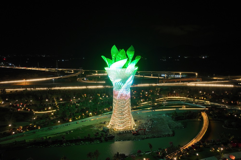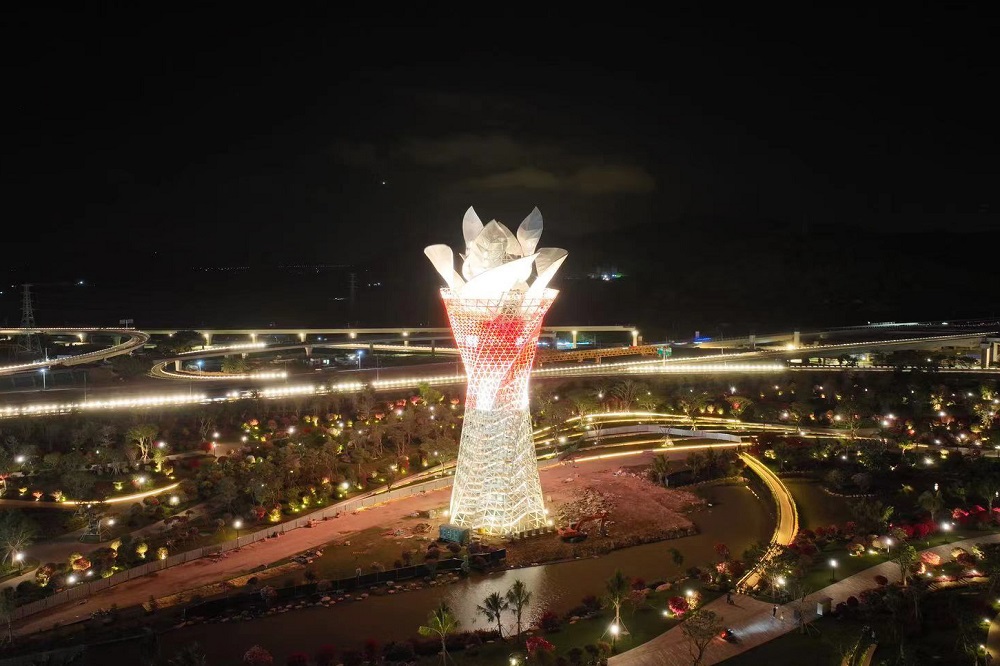 与此同时,三角梅采用动态旋转雕塑,造型似手捧花束,单个叶片采用异性空间桁架结构。与传统碳钢和铝合金材料相比,使用QD2001不锈钢可有效降低结构节点连接难度,提高全生命周期使用寿命且造价更低、安全性更强,非常适合异性曲面造型。