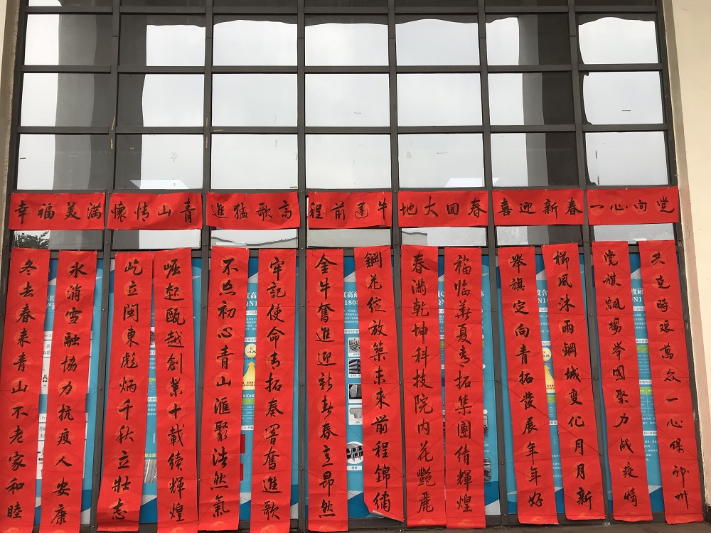 工作人员将春联挂在青拓科技食堂门口,寓意福驻壹号娱乐-com。