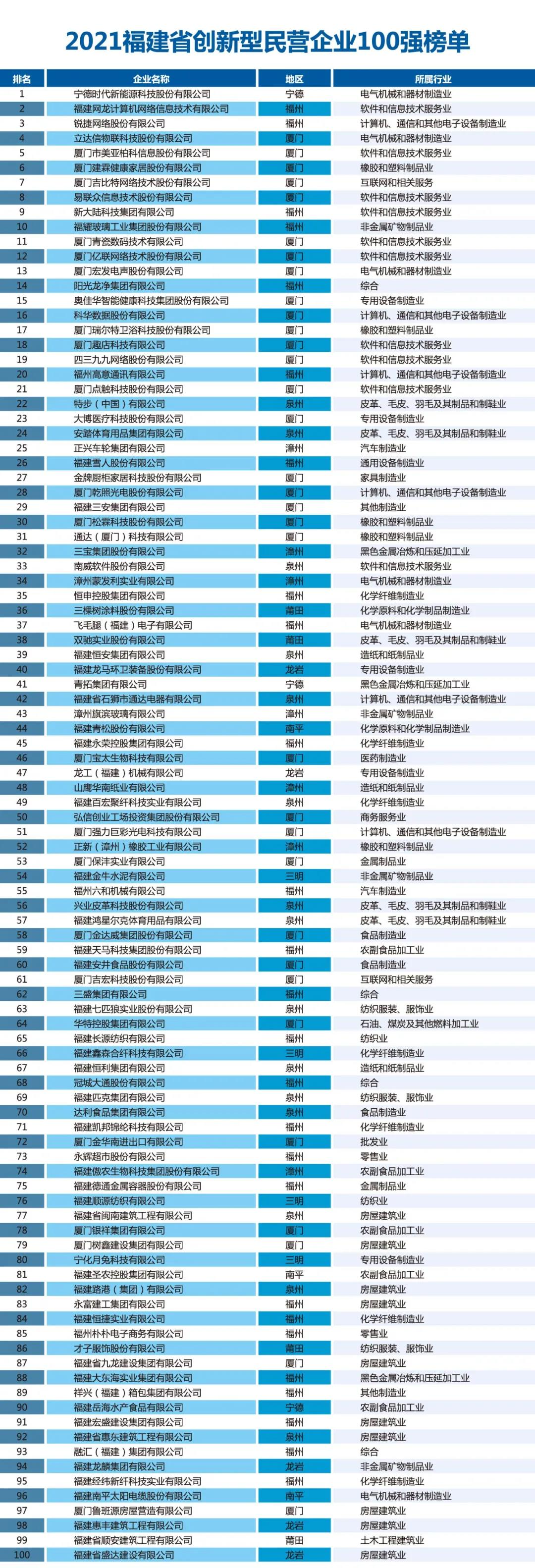 根据榜单,2021福建民营企业100强规模总量不断壮大,并呈现出头部企业优势明显、质量效益总体平稳、区域分布差异明显、社会贡献更加彰显、产业结构持续优化等特点,彰显了民营经济是福建发展的特色所在、活力所在、优势所在。
